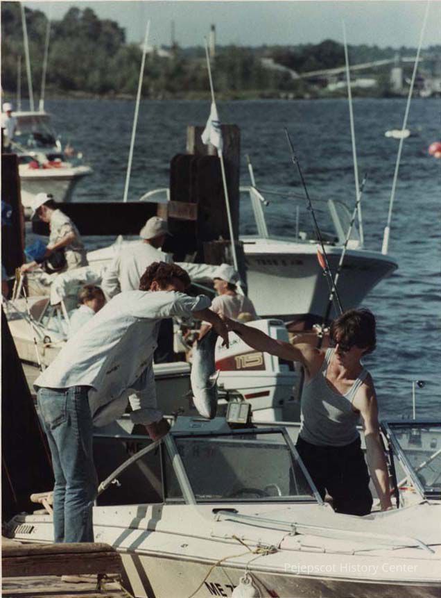 A color photographic view of people with a fish getting off a boat. This photo was published 8/12/1989.