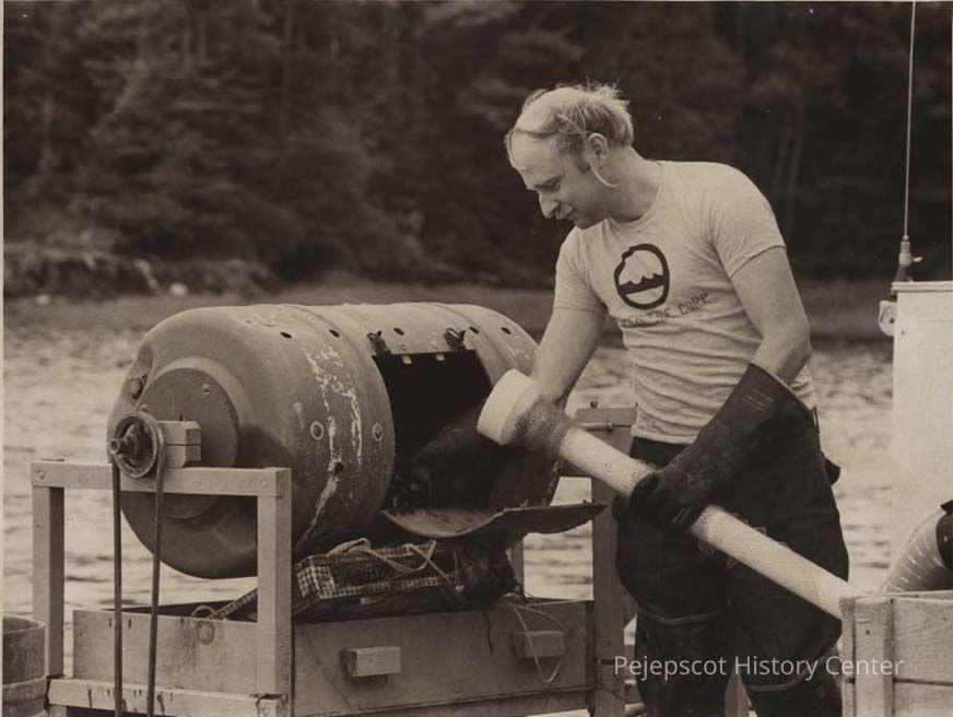 A B/W photographic view of Pete Miller taking mussels from a grader and sliding them into tubes. The Mussel grader in on board the Edulis on Wilson's Cove.