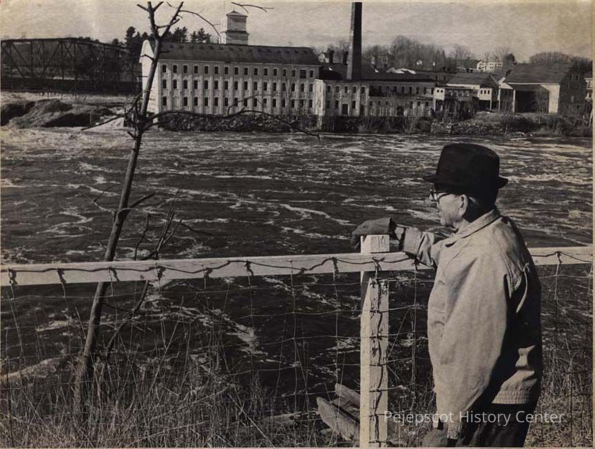 A B/W photographic view of Philip "Popeye" Lachance looking at the Androscoggin River and remembering the Flood of 1936.