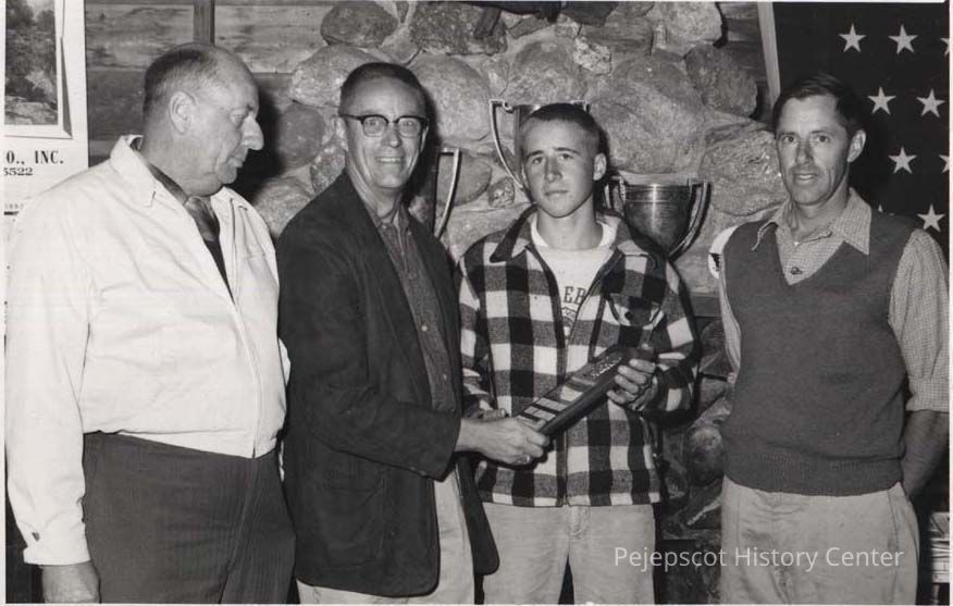 A B/W photographic view of Phippen Sanborn and others. Phippen Sanborn is retiring as Arena Skating teacher. Those in the picture are, Commodore Clarence A. Roberts, Phippen Sanborn. Richard Harkell and Albert Fletcher.