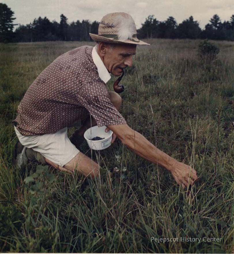 A color photographic view of a man picking blueberries. This photo was published 8/12/1988.