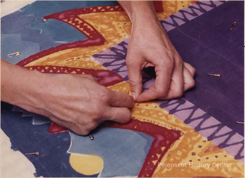 A color photographic view of pinning a decoration to something. This photo was published 9/12/1991.