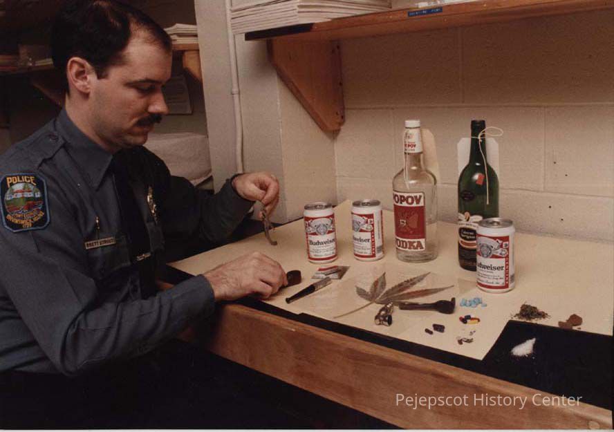 A color photographic view of a Brunswick Police officer Brett Strout setting up a display on drugs. This photo was published 1/30/1989.