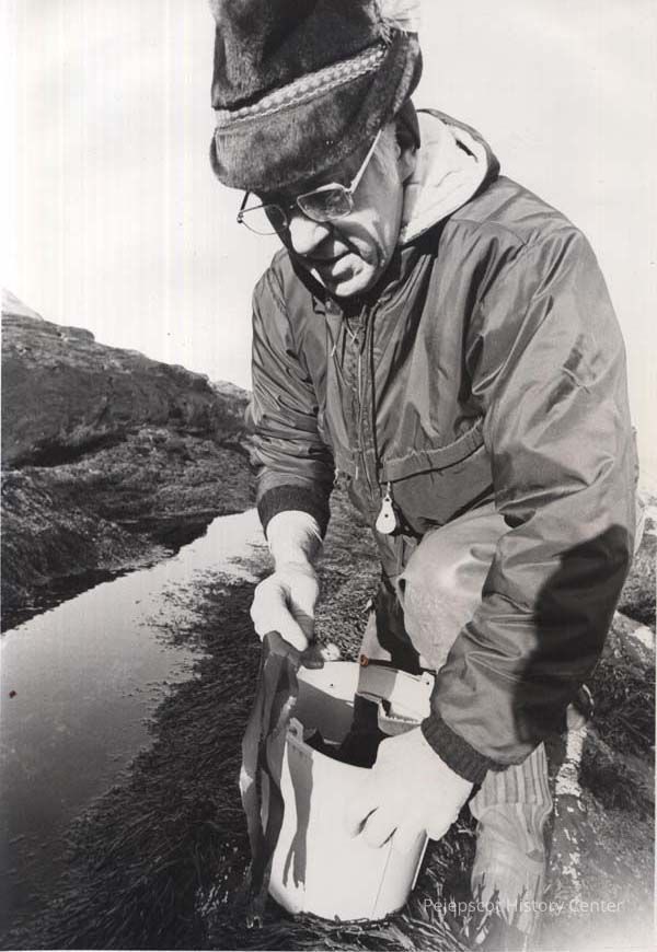 A B/W photographic view of Prof. Alton Gustafson, Botany Dept., Bowdoin College collecting Algae. This photo was published 2/10/1975.