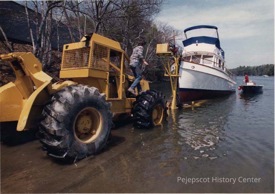 A color photographic view of putting a boat into the water. This photo was published 5/2/1990.