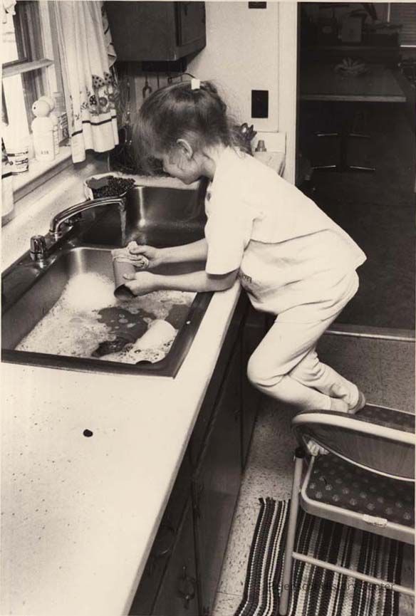 A B/W photographic view of Rachel Adams washing the dishes. This photo was published 4/24/1992.