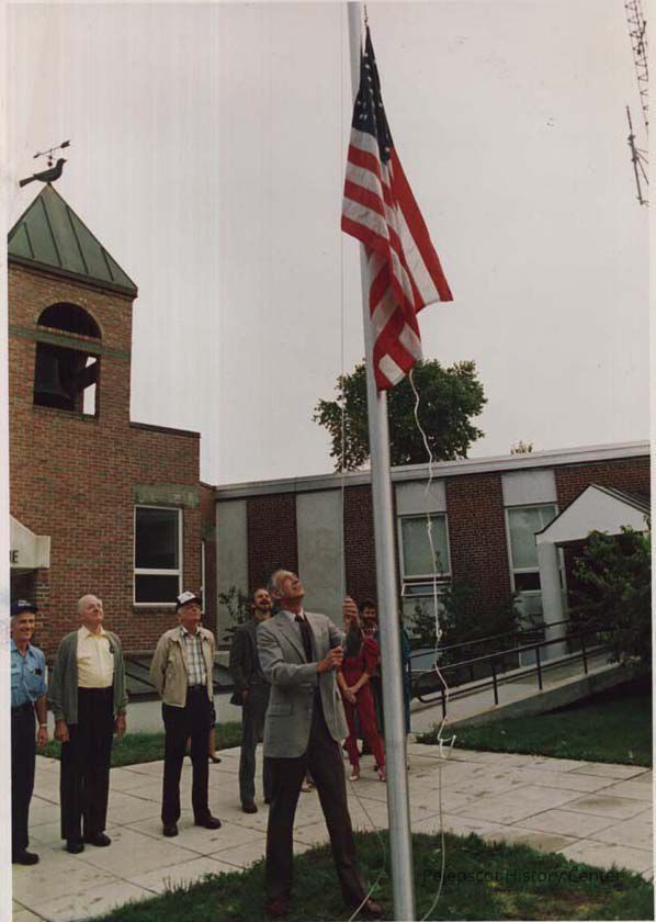 A color photographic view of raising the flag at a school. This photo was published 9/15/1987.