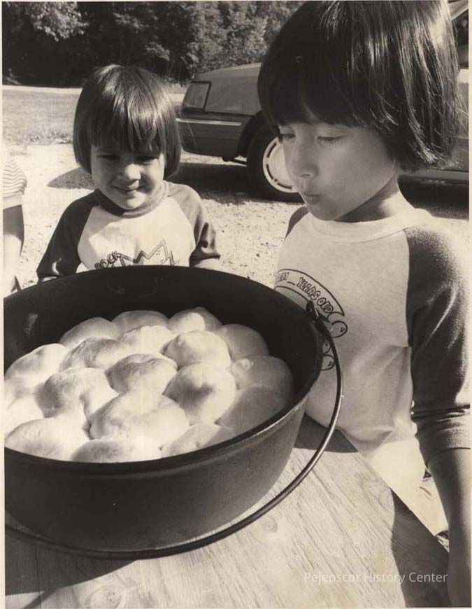 A B/W photographic view of Rebekah and Emily Gagnon looking at some biscuits. This photo was published 8/17/1992.