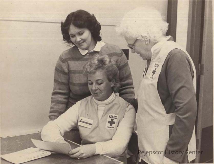 A B/W photographic view of Red Cross volunteers. This photo was published 1/4/1984.