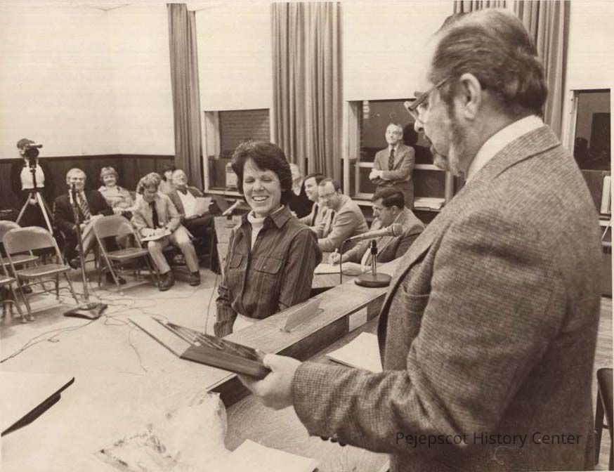 A B/W photographic view of Reginald Pinkham and Happy Dunn. Marked on front, "Brunswick Council 1-3-1984. Dunn's last meeting and Pinkham stepped down as chairman".