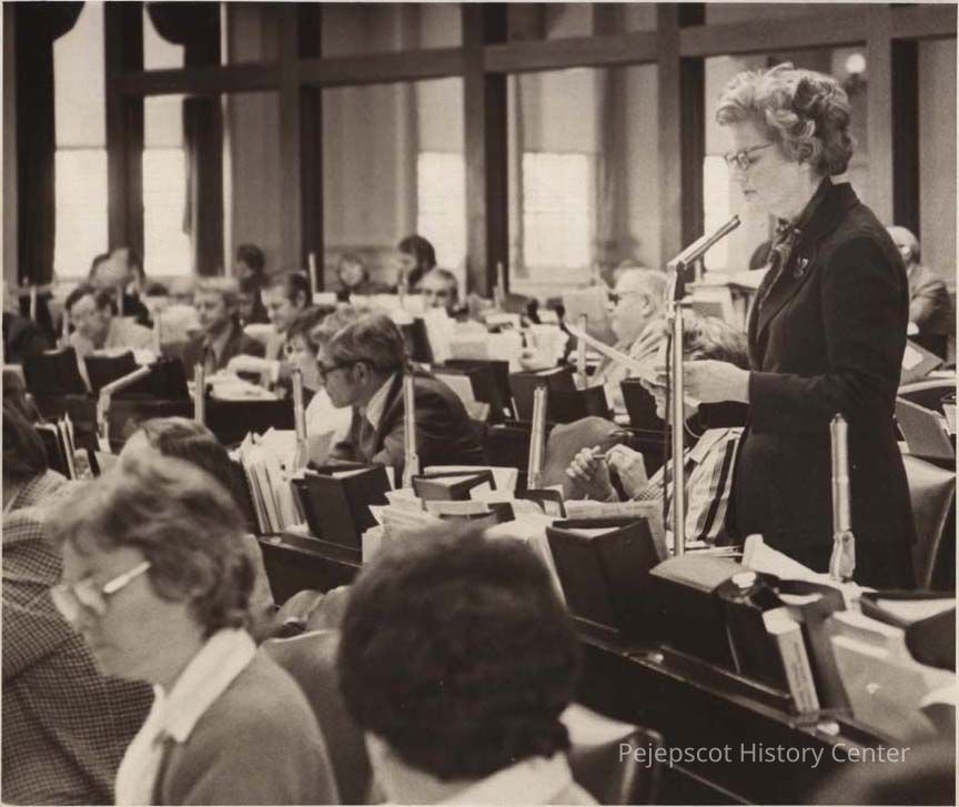 A B/W photographic view of Rep. Anne Bachrach, D-Brunswick, urges state representatives to accept her amendment. This photo was published 2/24/1978.