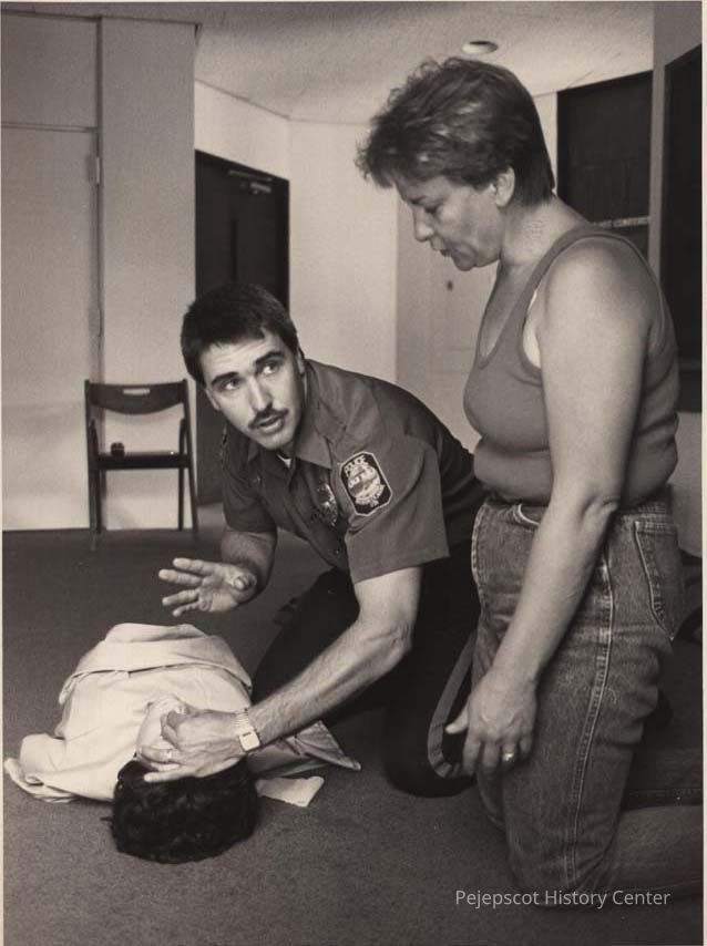 A B/W photographic view of Rick Desjardins of Brunswick Police Department and Betsy O'Brien of the Lincoln County Sheriffs Office.