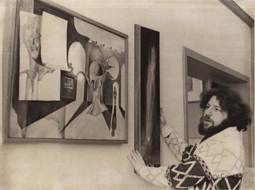 A B/W photographic view of Robert Meade-Knight setting up an exhibit at Curtis Library. This photo was published 2/15/1979.