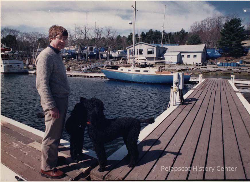 A color photographic view of Robert Small, with his 2 dogs standing on the dock in front of the Great Island Boat Yard.