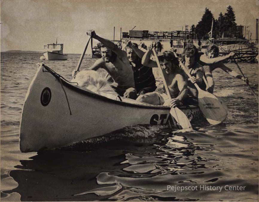 A B/W photographic view of Robet Waddle paddling a canoe. This photo was published 6/20/1975.