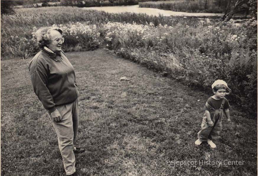 A B/W photographic view of Ruth and neighbor Sam Feldman in Feldman's backyard at New Meadows.. This photo was published 9/9/1972.