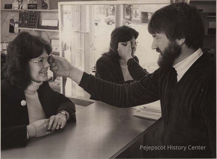 A B/W photographic view of Sarah Hoare (customer) and Will Plummer at Coastal Opticians. This photo was published 4/2/1980.