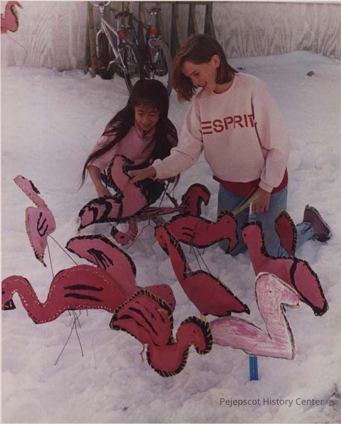 A color photographic view of setting up displays for Christmas at Harpswell. This photo was published 12/23/1987.