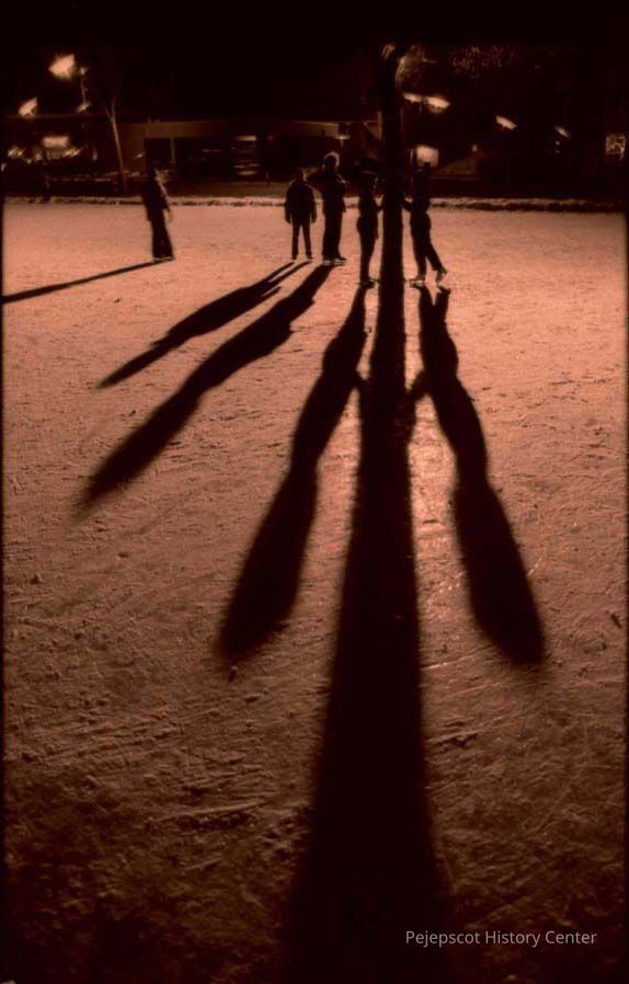 A color photographic view of shadows on ice. Night skating on the Mall. 12/31/1977.