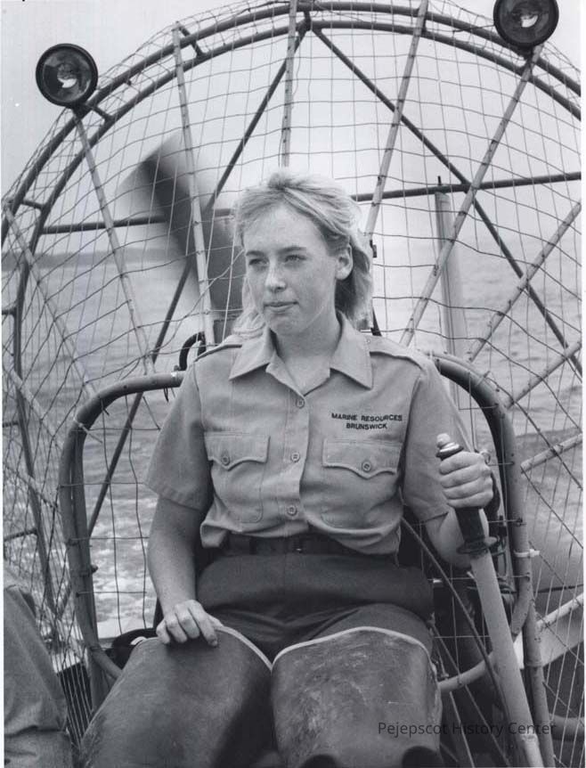 A B/W photographic view of Shelagh Catlin, a Brunswick Marine Resources Officer. This photo was published 5/28/1992.