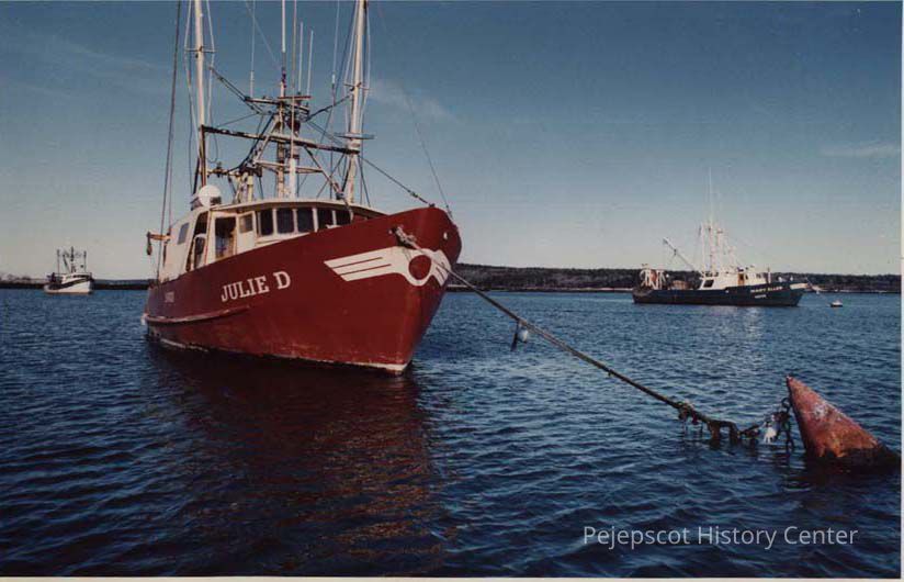 A color photographic view of shrimp boat Julie D at Cundy's Harbor. This photo was published 3/4/1992.
