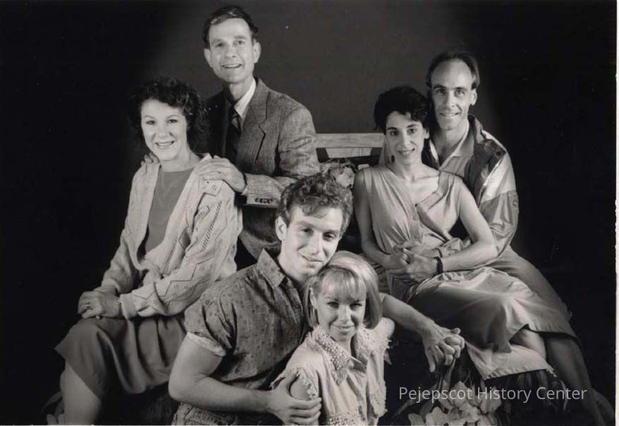 A B/W photographic view of Jay Maris, John-Charles Kelly, Pamela Khoury, James MacCammond, Joe Langworth and Julie Dixon. They are all in the Maine State Music Theater production of "Baby", 8/11-22/1992.Collection