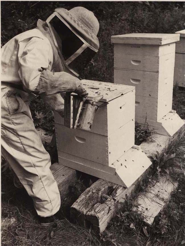 A B/W photographic view of smoking of bees to make them easier to handle. This photo was published 9/14/1981.