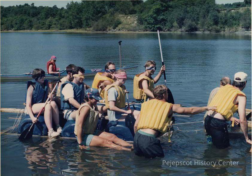 A color photographic view of some kids paddling a raft. Marked on front, "1/2 the students were "blind" and the other 1/2 are mute. Still they built a raft and crossed Little River."