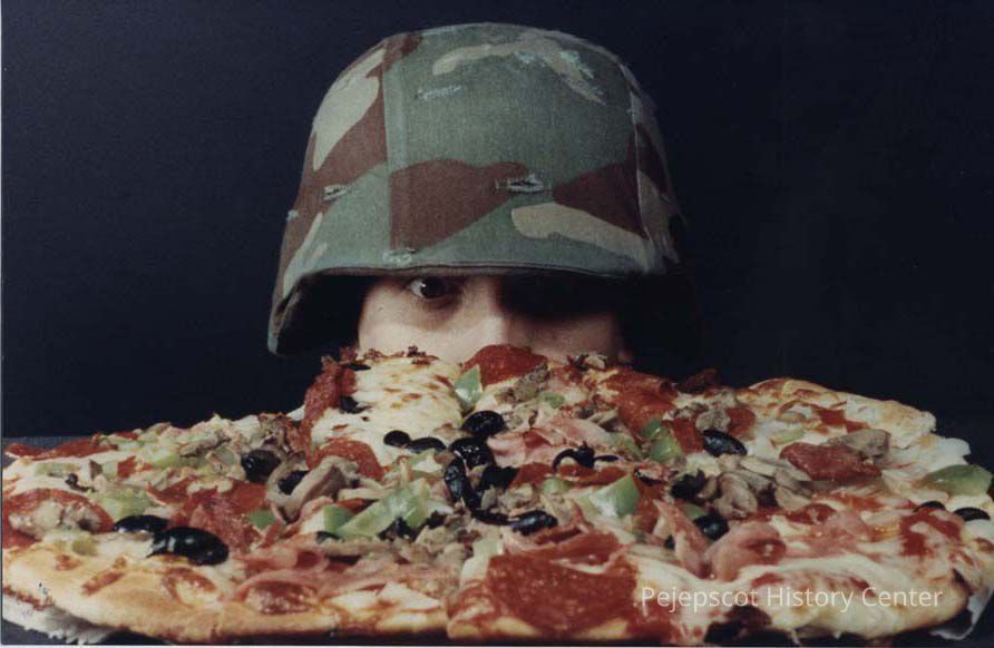 A color photographic view of someone with a helmet on looking at a pizza. This photo was published 10/26/1989.
