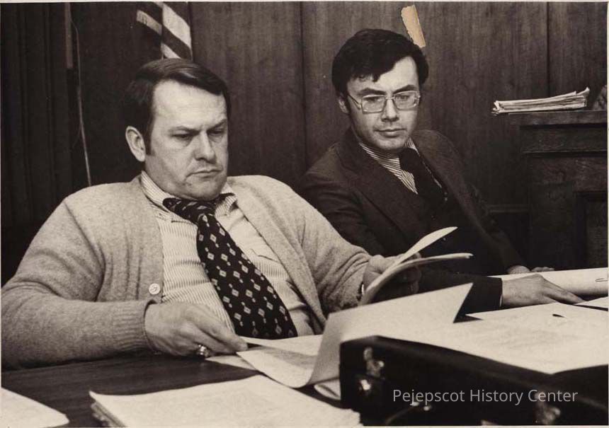 A B/W photographic view of Steve McCausland and an unidentified Brunswick Councilman.