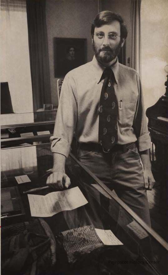A B/W photographic view of Stuart A. Kohler, Coordinator of the Pejepscot Historical Society Museum on Lincoln Street. This photo was published 7/6/1977