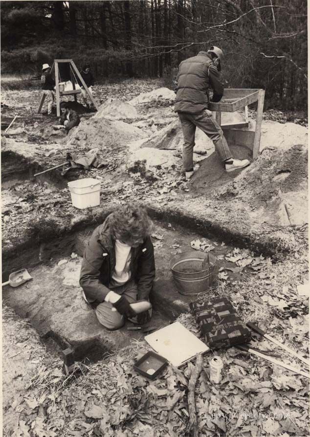 A B/W photographic view of student archaeologists along the Androscoggin River. This photo was published 5/13/1992.