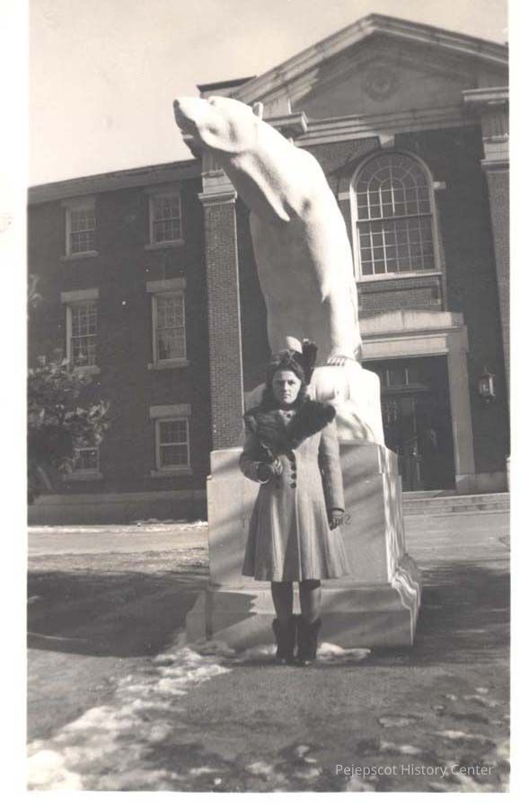 A B/W photographic view of an unknown woman standing in front of the Bowdoin polar bear.