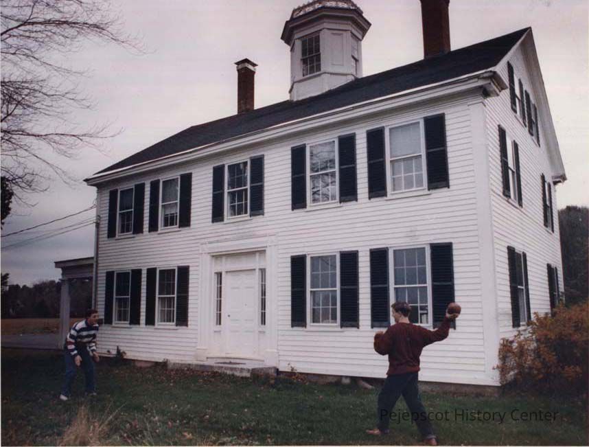 A color photographic view of the Carroll Pennell's House, Pennellville Road. Andrew and Sam Pennell are playing pass with the football (Sam Pennell on the left and Andy on the left). The building is known as the James Pennell House.