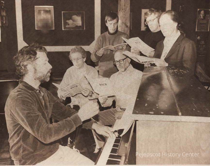 A B/W photographic view of the Chorale at practice. This photo was published 11/11/1982.