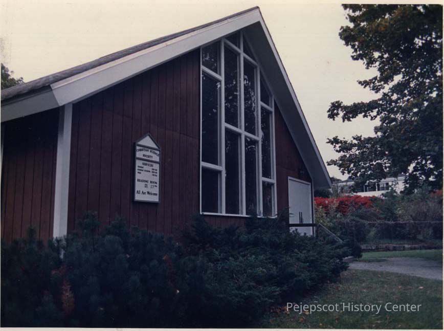 A color photographic view of the Christian Science Society Church. This photo was published 10/21/1988.