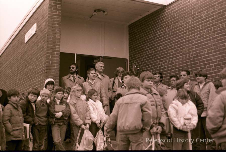 A B/W photographic view of the crowd at ground breaking for the Harpswell Island School.