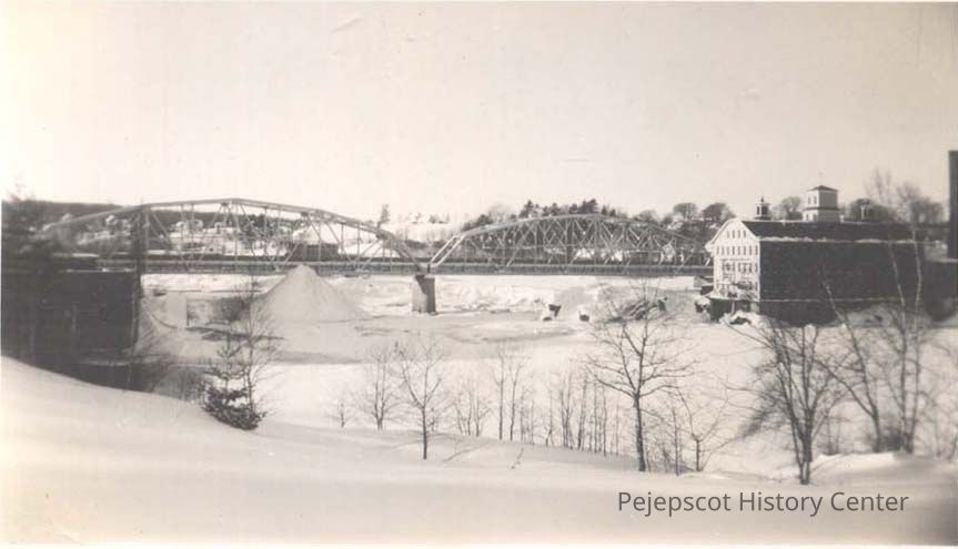 A B/W photographic view of the Frank J. Wood Bridge in the winter. The photo is taken from the Brunswick side looking up stream.