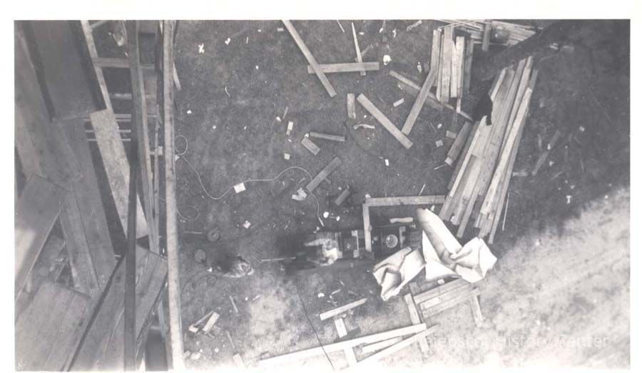 A B/W photographic view of the ground below the water tower. This was taken from the top of the water tower shown in 2010.87.1