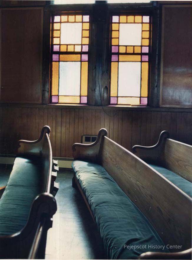 A color photographic view of the interior of the Church of Christ, on the corner of Jordan Avenue and Federal Street.