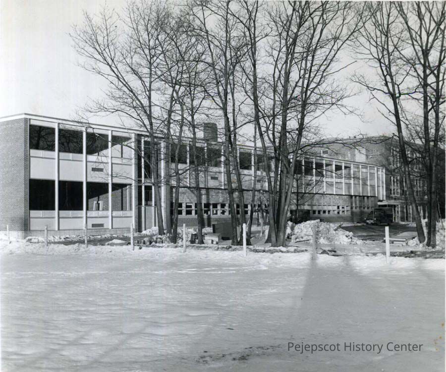 A B/W photograph view of the new addition to Brunswick High School on McKeen Street. c. 1962.