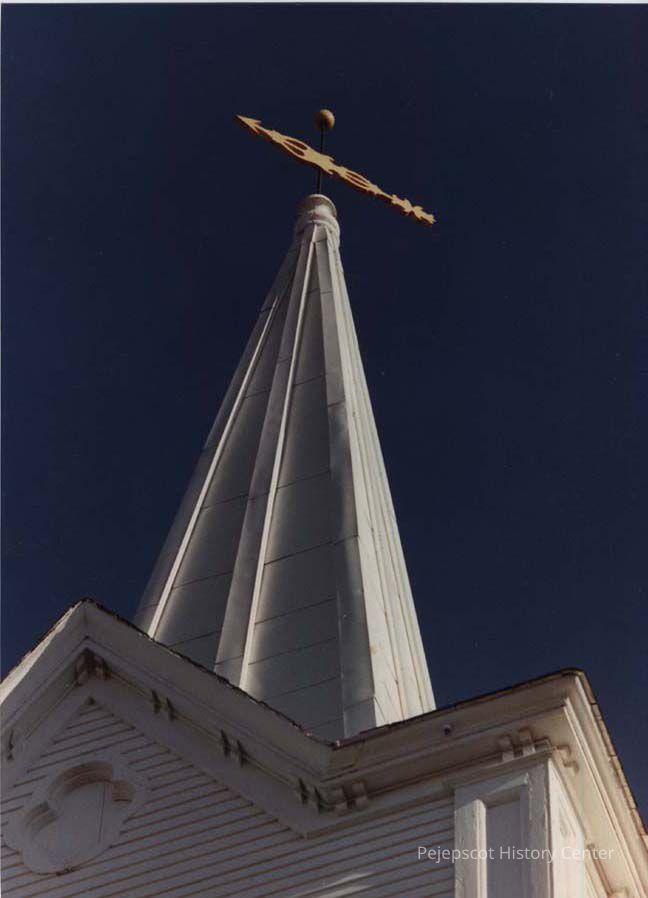 A photo view of the steeple at the former United Methodist Church. 12/8/1989.