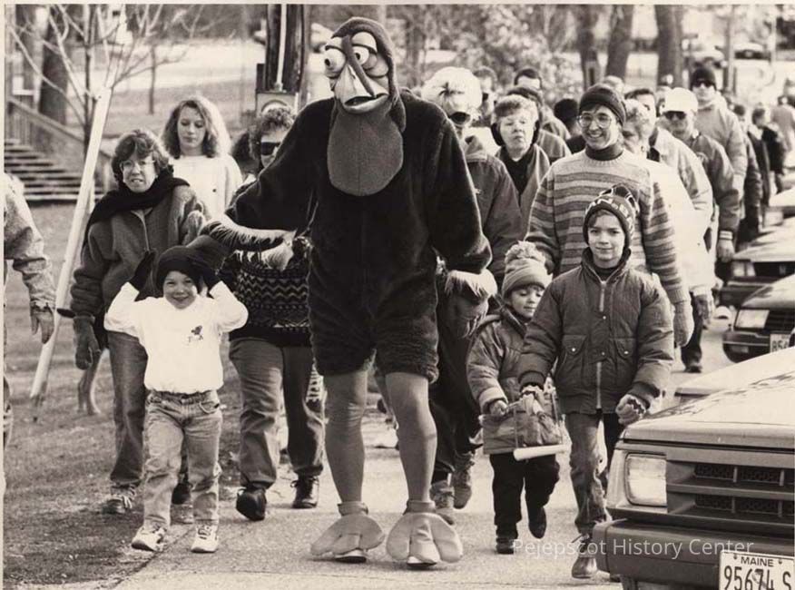 A B/W photographic view of B. J. Neptune and Louis Dearborn (the turkey) lead the Turkey Walk. They are on Maine Street with the Mall and Gazebo on the left.