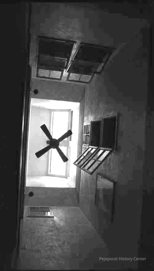 A B/W photographic view of the ventilation system in Dr. John Skillins' home on Bailey's Island.Collection
