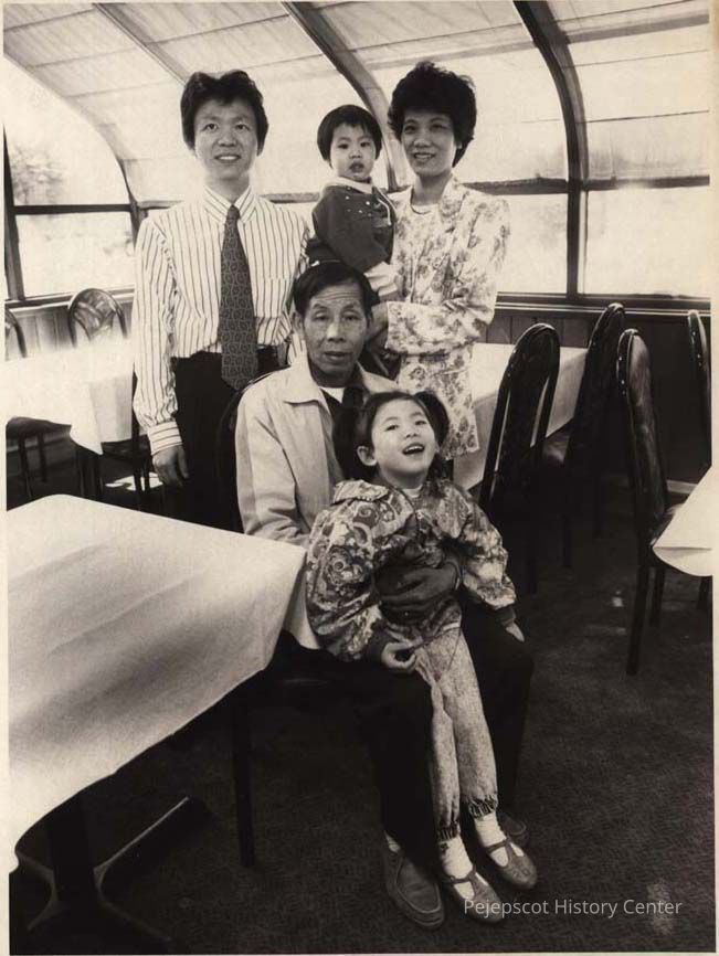 A B/W photographic view of the Wang family, (back row l to r) Joseph, Jason, Lolo (seated) Hofa (father-in-law) and Connie. They are the owners of the China Pearl restaurant on 71 Cumberland Street.