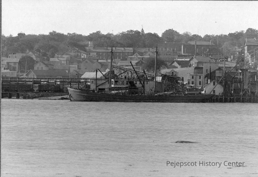 A B/W photograph of the Wiscasset waterfront, with Main St. to the right (the Coca-Cola sign would be on the left-hand side of the street). The hip-roofed building on the left side of Main St. beyond the sign is still standing. The tall brick building at the far right of the photo is no longer there (I think it's about where the Key Bank building is now). The steeple in the center of the photo above the treeline belongs to the 1824 Lincoln County Courthouse. The train tracks run across Main Street along the waterfront (note freight cars to left of ship). The three-story building that is behind the two-story white building by the stern of the ship, is still there. The two schooners (Luther Little and Hesper) that were the much-photographed decaying schooners were brought to the Wiscasset waterfront in 1932 (long after this photo was probably taken). There was a lumber and coal operation on the Wiscasset waterfront that involved both a narrow gauge railroad and coastal schooners.