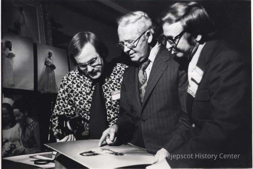 A B/W photographic view of three men, James Pierce and Eric Pierce (of the Pierce Studio) and Sydney Kanter. This photo was published 5/25/1972.