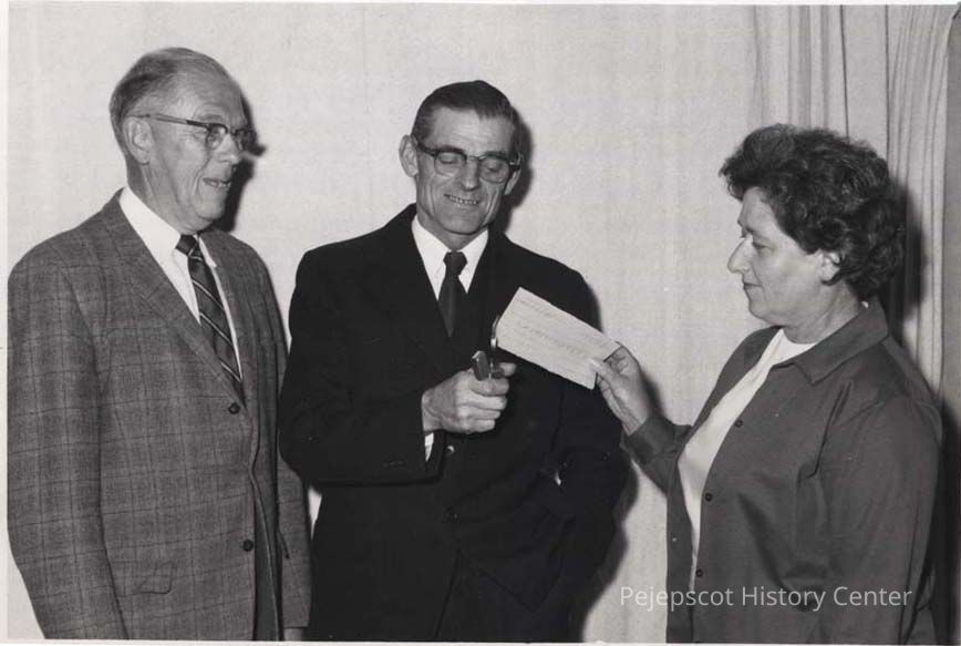 A B/W photographic view of three people burning something. They are l to r Paul Burbank, President, Cundy's harbor Fire Department, Geo. H. Swallow Fire Chief and Marion Jordan, Treasurer of the fire department.