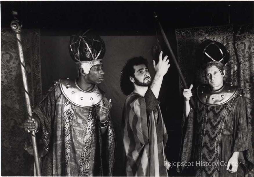 A B/W photographic view of Stacey Robinson (as Caiaphas), Dan Cooney (as Judas Iscariot) and Dick Decareau (as Annas) in the Maine State Music Theater production of "Jesus Christ Superstar", 7/7-25/1992.
