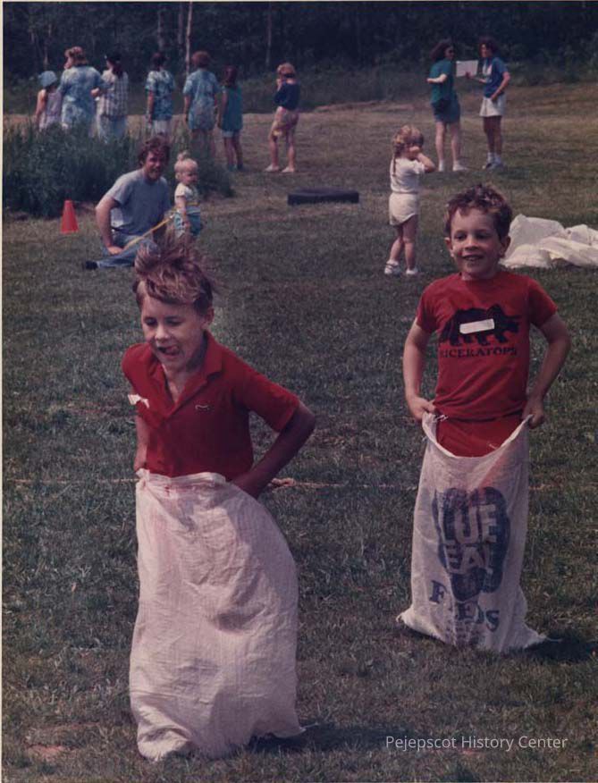 A photo view of two boys in a potato sack race. 6/20/1988.